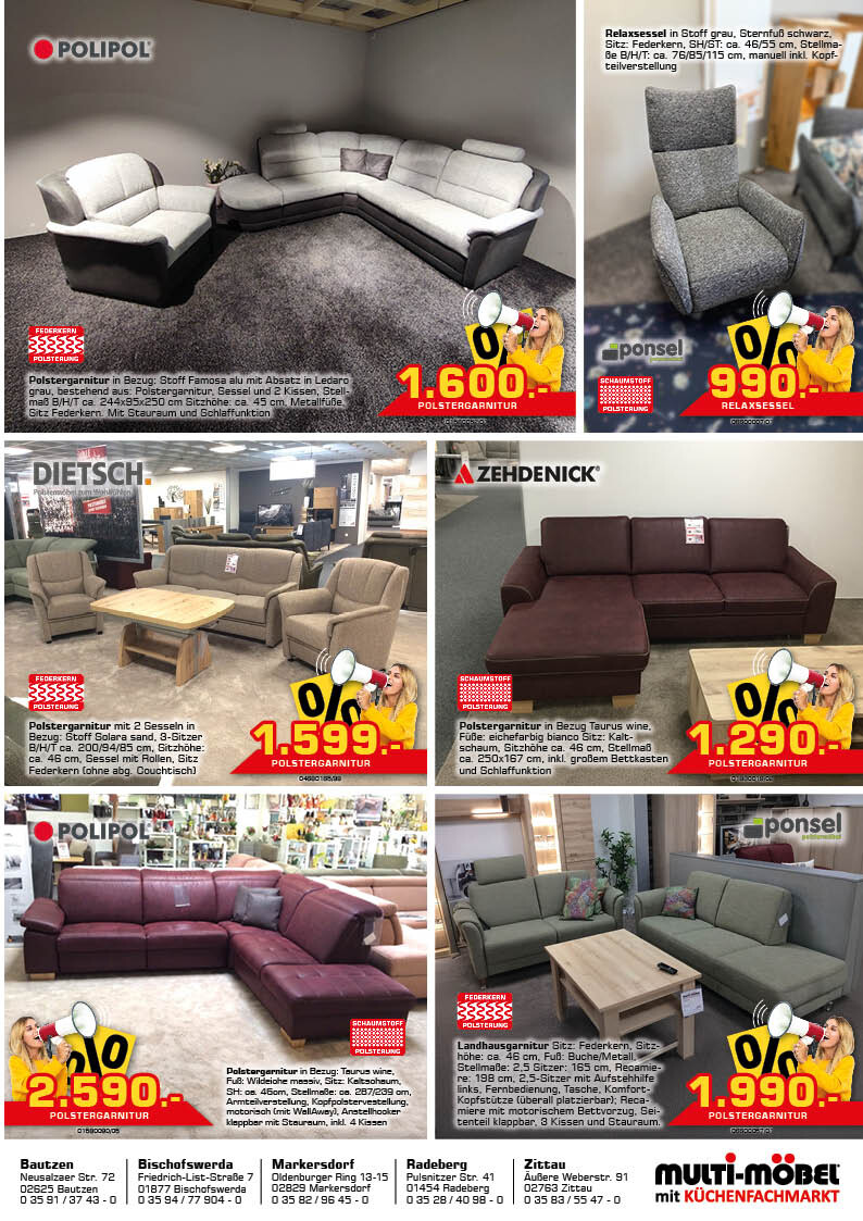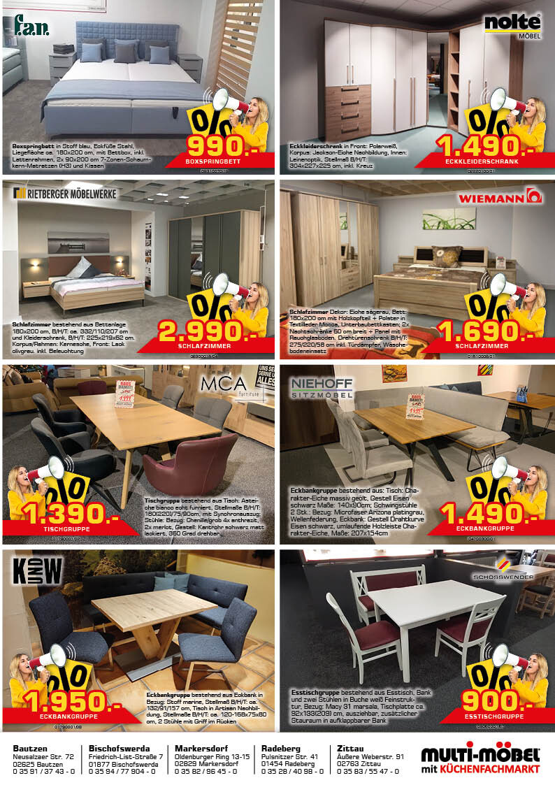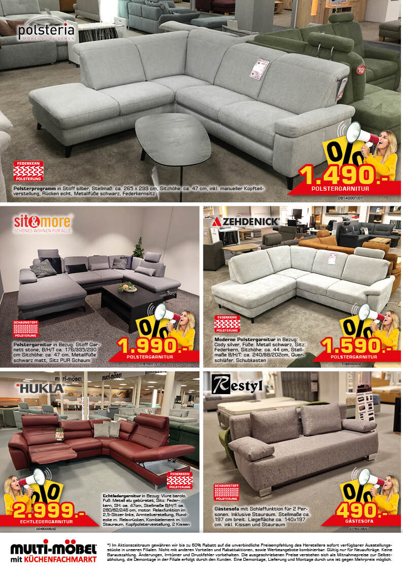 *) Im Aktionszeitraum gewähren wir bis zu 60% Rabatt auf die unverbindliche Preisempfehlung des Herstellers sofort verfügbarer Ausstellungsstücke in unseren Filialen. Nicht mit anderen Vorteilen und Rabattaktionen, sowie Werbeangebote kombinierbar. Gültig nur für Neuaufträge. Keine Barauszahlung. Änderungen, Irrtümer und Druckfehler vorbehalten. Die ausgeschriebenen Preise verstehen sich als Mitnahmepreise zur Selbstabholung, die Demontage in der Filiale erfolgt durch den Kunden. Eine Demontage, Lieferung und Montage durch uns ist gegen Mehrpreis möglich.