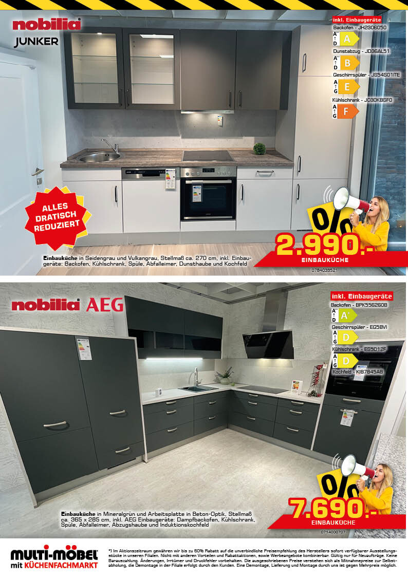 *) Im Aktionszeitraum gewähren wir bis zu 60% Rabatt auf die unverbindliche Preisempfehlung des Herstellers sofort verfügbarer Ausstellungsstücke in unseren Filialen. Nicht mit anderen Vorteilen und Rabattaktionen, sowie Werbeangebote kombinierbar. Gültig nur für Neuaufträge. Keine Barauszahlung. Änderungen, Irrtümer und Druckfehler vorbehalten. Die ausgeschriebenen Preise verstehen sich als Mitnahmepreise zur Selbstabholung, die Demontage in der Filiale erfolgt durch den Kunden. Eine Demontage, Lieferung und Montage durch uns ist gegen Mehrpreis möglich.