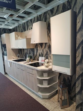 Diese elegante einzeilige Küche aus dem Hause Nobilia überzeugt durch ihre Kombination aus warmen Holzdekoren, matten weißen Fronten und einer hochwertigen Arbeitsplatte in Marmoroptik. Das harmonische Design wird durch moderne Geräte und offene Regale perfekt abgerundet