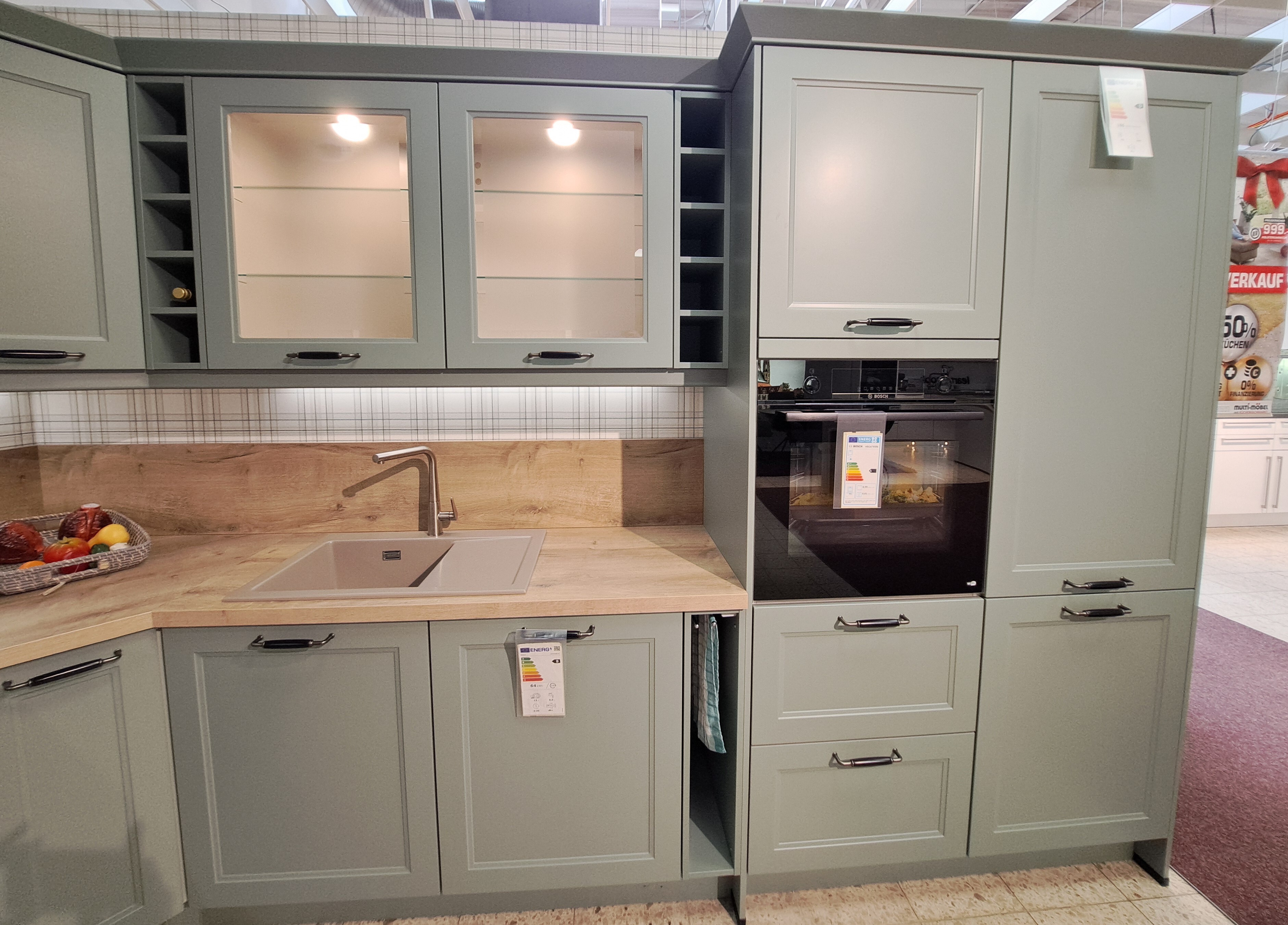 Diese stilvolle Landhausküche von Nobilia verbindet zeitlose Eleganz mit moderner Funktionalität. Die sanft grün gestrichenen Fronten sorgen für eine ruhige, harmonische Atmosphäre, während die Arbeitsplatte in warmer Holzoptik Gemütlichkeit und Natürlichkeit in den Raum bringt.