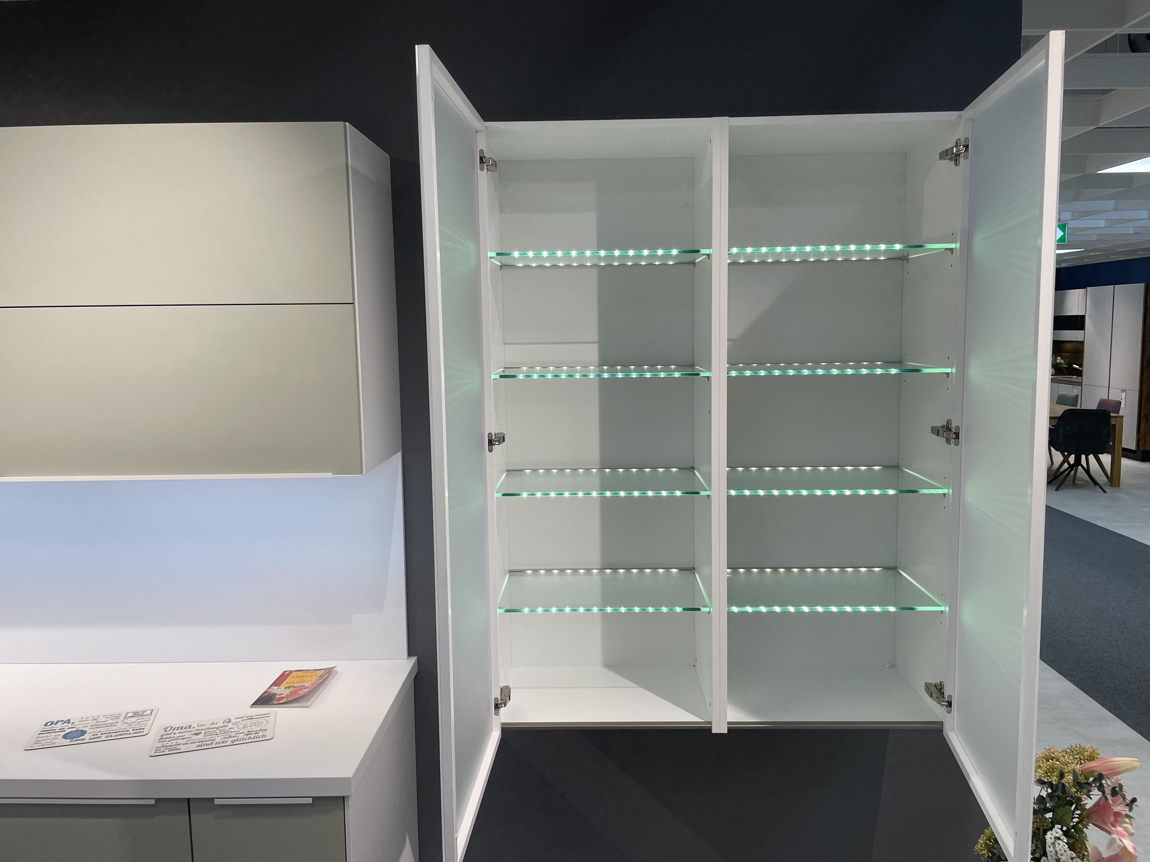Als absolute Highlights sind zu erwähnen die großen beleuchteten Hängeschränke und die Natursteinarbeitsplatte.