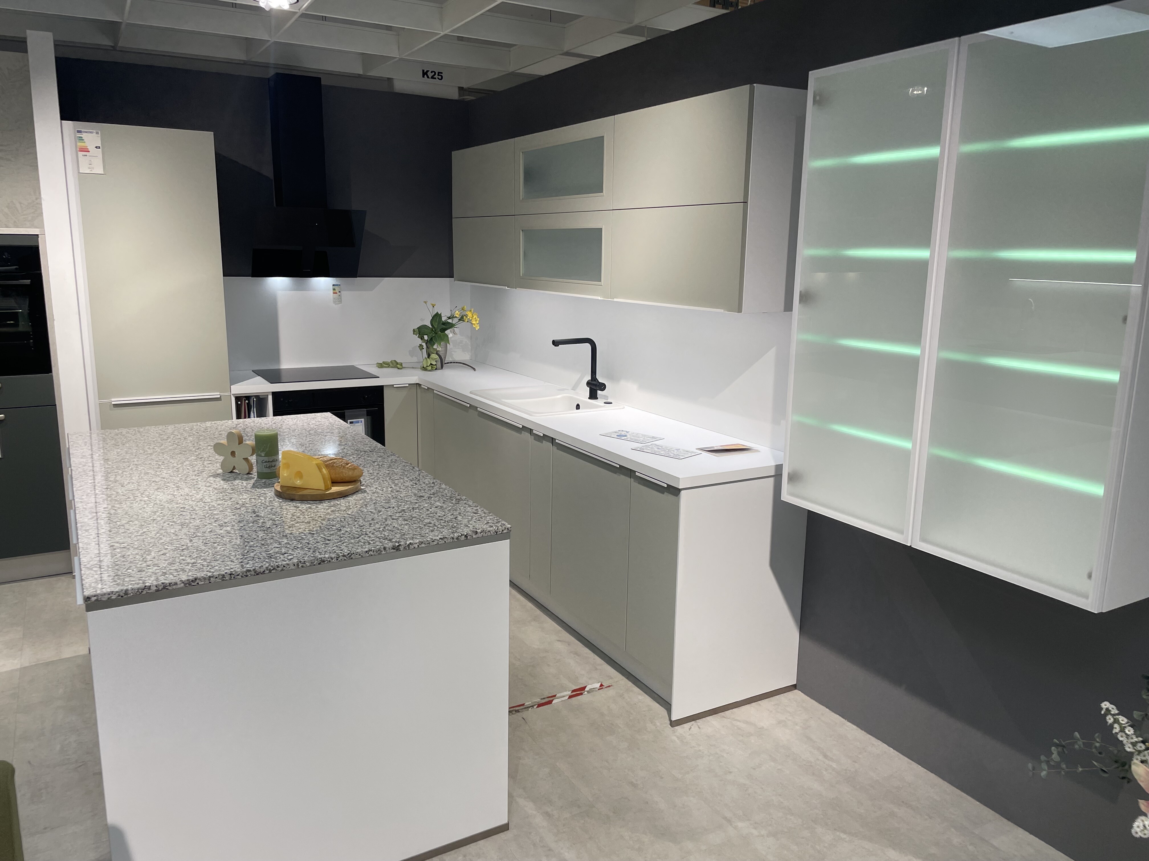 Als Küche in abgestimmtem Mattem Grün mit weißem Korpus und weißer Arbeitsplatte ist die Küche super geeignet für dunkle Räume und für Leute, die sich trauen mal etwas besonderes haben zu wollen.